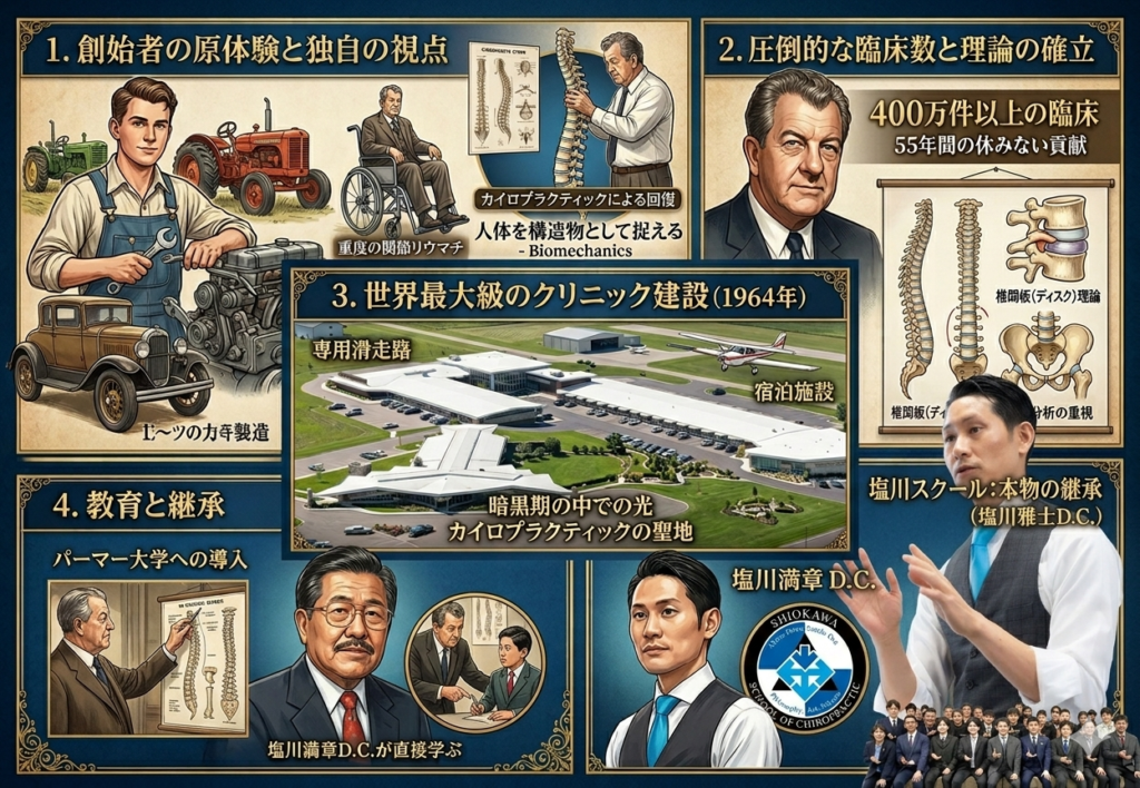 パーマー大学への導入: B.J.パーマー(カイロプラクティック発展の父)が、その実績を認め、大学のカリキュラムに採用しました。日本への繋がり: 塩川満章D.C.が直接Dr. ガンステッドから学び、その技術と精神を日本に持ち帰ったことが分かります。そして、塩川満章D.Cの愛弟子でもある塩川雅士D.Cがその意思を継ぎ塩川スクールで本物のガンステッド・カイロを教えています。
